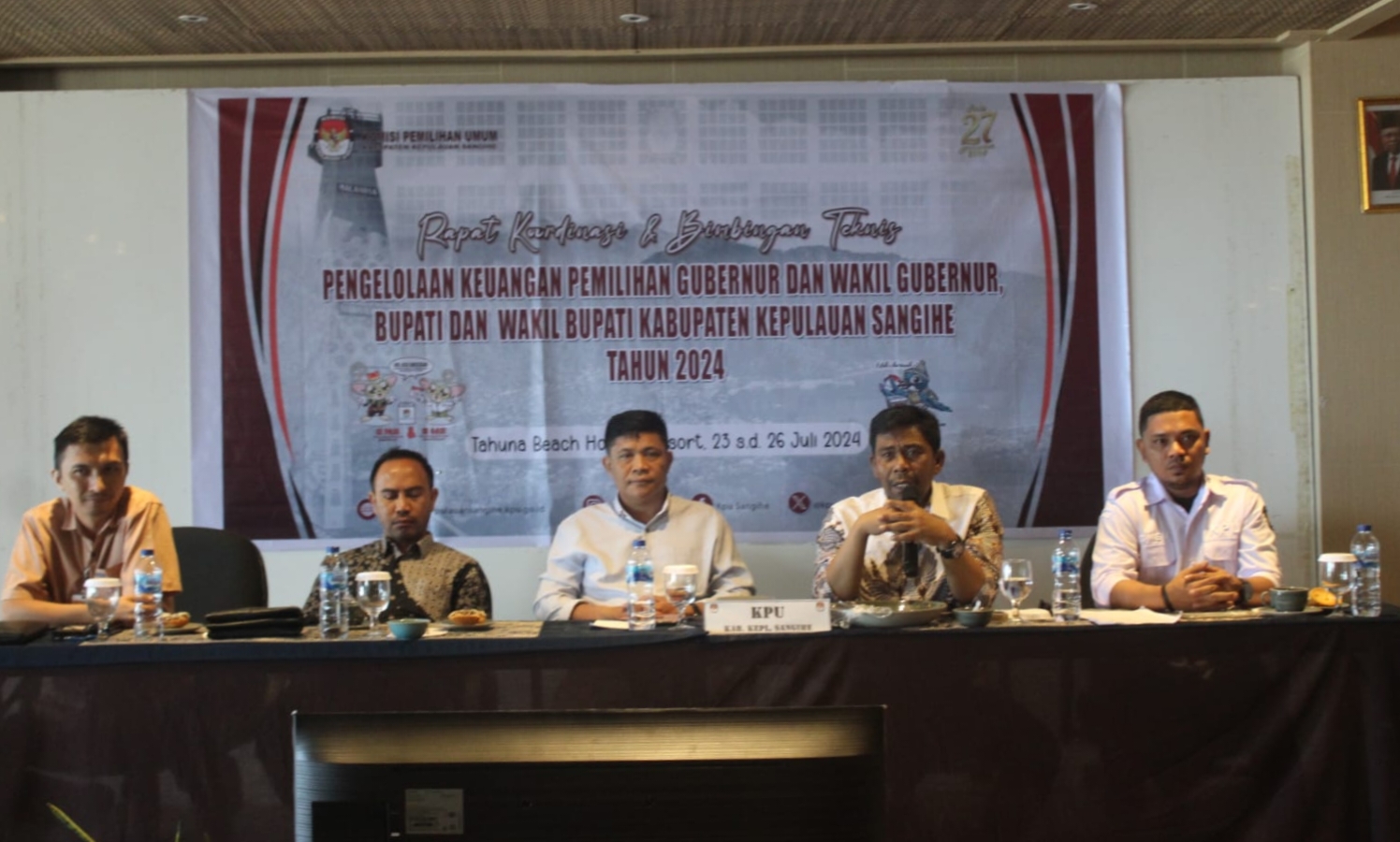 Manadoline.com, Sangihe- Rapat Koordinasi (Rakor) Pengelolaan Keuangan dan Bimbingan Teknis (Bimtek) untuk Pemilihan Gubernur dan Wakil Gubernur, serta Bupati dan Wakil Bupati tahun 2024 di gelar KPU Kabupaten Kepulauan Sangihe. Acara ini diselenggarakan di Tahuna Beach Hotel pada Kamis, 25 Juli 2024.