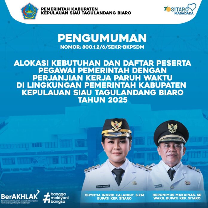 DISKOMINFO, SITARO – Pemerintah Kabupaten Kepulauan Siau Tagulandang Biaro (Sitaro) melalui Badan Kepegawaian dan Pengembangan Sumber Daya Manusia (BKPSDM) secara resmi mengumumkan alokasi kebutuhan serta tahapan pemberkasan Pegawai Pemerintah dengan Perjanjian Kerja (PPPK) Paruh Waktu Tahun 2025 di lingkungan Pemerintah Kabupaten Kepulauan Sitaro.